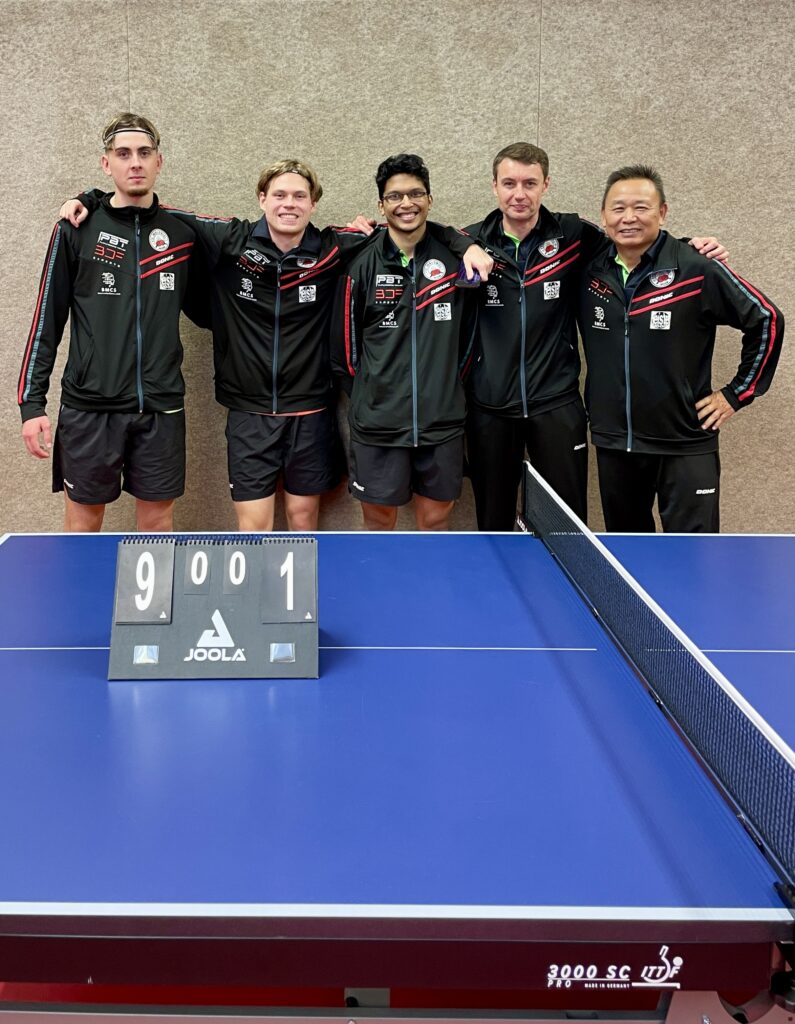 Jeet musste im Spiel gegen Schreitz dann über die volle Distanz gehen, gewann am Ende aber mit 12:10 im fünften Satz. Kirill siegte parallel klar gegen Janicki mit 3:0. Im unteren Paarkreuz dann zwei 5-Satz Spiele mit dem besseren Ende für unsere Spieler. Tobias kämpfte in 5 Sätzen gegen das „hessische Abwehrbollwerk“ Andreas Gehm und gewann im fünften Satz 11:8. Christian musste ebenfalls gegen Dettmar über die volle Distanz, setzte sich aber im 4. und 5. Satz jeweils in der Verlängerung durch. Damit 6:0 Zwischenstand und den Sieg bereits eingefahren..